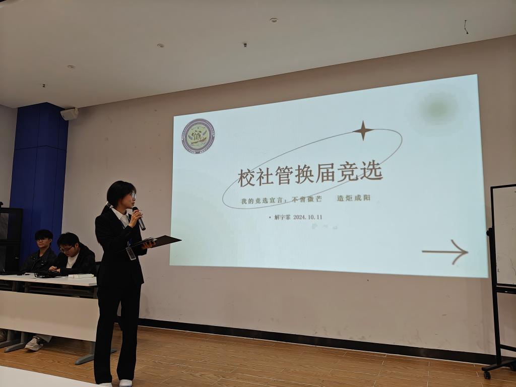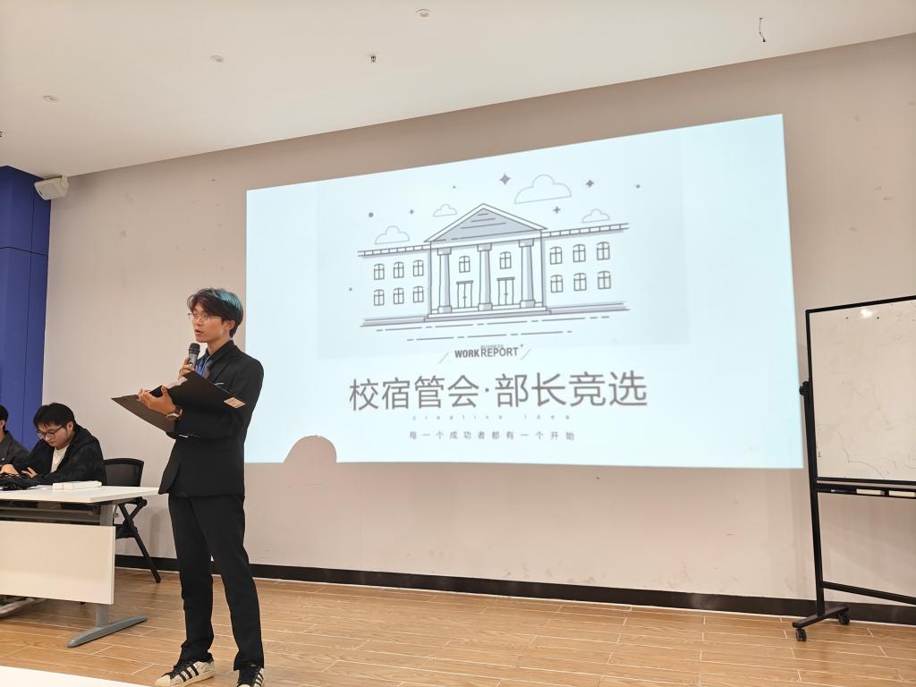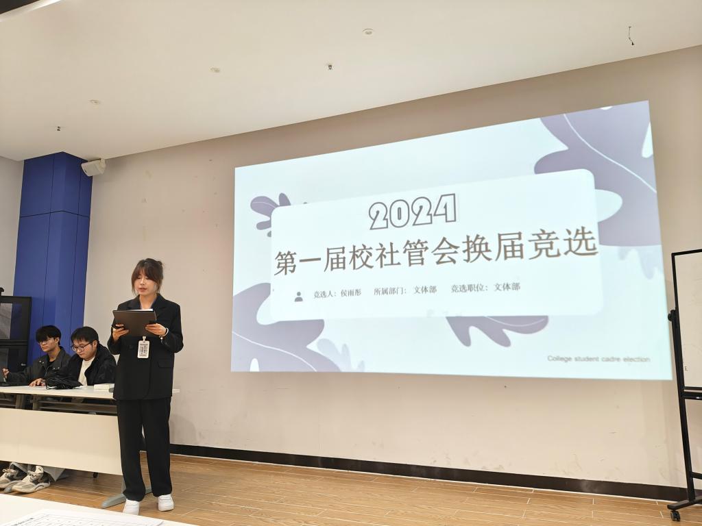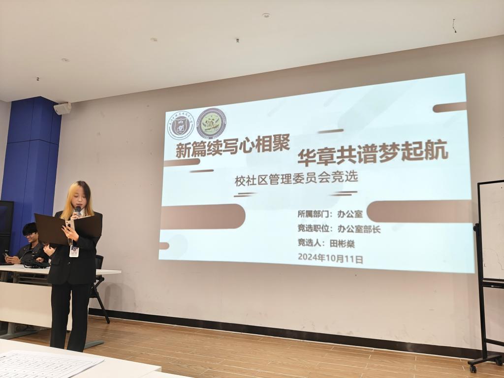 10月11日重阳节,下午17点40分,在E4人防大楼二层会议室举行首届校社区自治管理委员会(简称校社管会)换届大会。16名同学参与竞选,其中罗杰、段体辉、李洁竞选主席,田彬燊、侯哲、马彦斌竞选办公室主任,解宇霏、李佳林、孙甜甜竞选宣传部部长,李鑫、段姝含竞选纪检部部长,赖恒浩竞选生活部部长,冯鑫、侯雨彤、王旭瑞竞选文体部部长,唐敏竞选外联部部长。